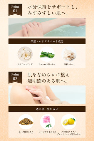 【うるおいを守る保湿サポート成分配合】 アセチルヒアルロン酸Na、加水分解コラーゲン、水溶性プロテオグリカン、ナイアシンアミドなどの保湿成分を配合。洗い流した後も、つっぱりにくいしっとりとした肌へ導きます。