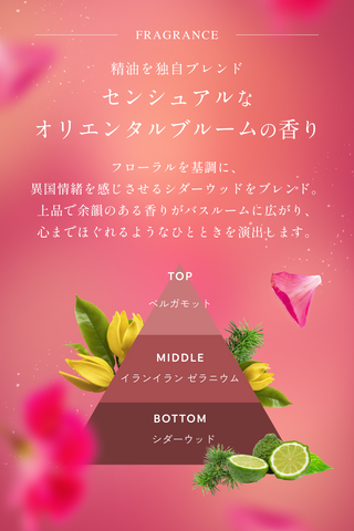【センシュアルなオリエンタルブルームの香り】 フローラルを基調に、異国情緒を感じさせるオリエンタルな香りを独自にブレンド。上品で余韻のある香りがバスルームに広がり、洗うたび、心までほぐれるようなひとときを演出します。